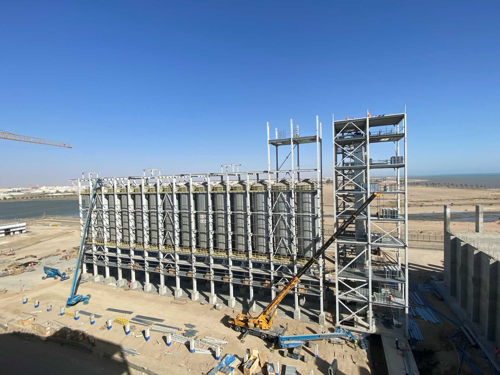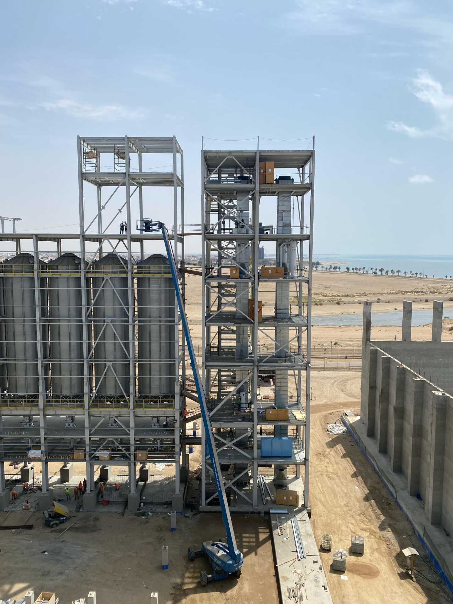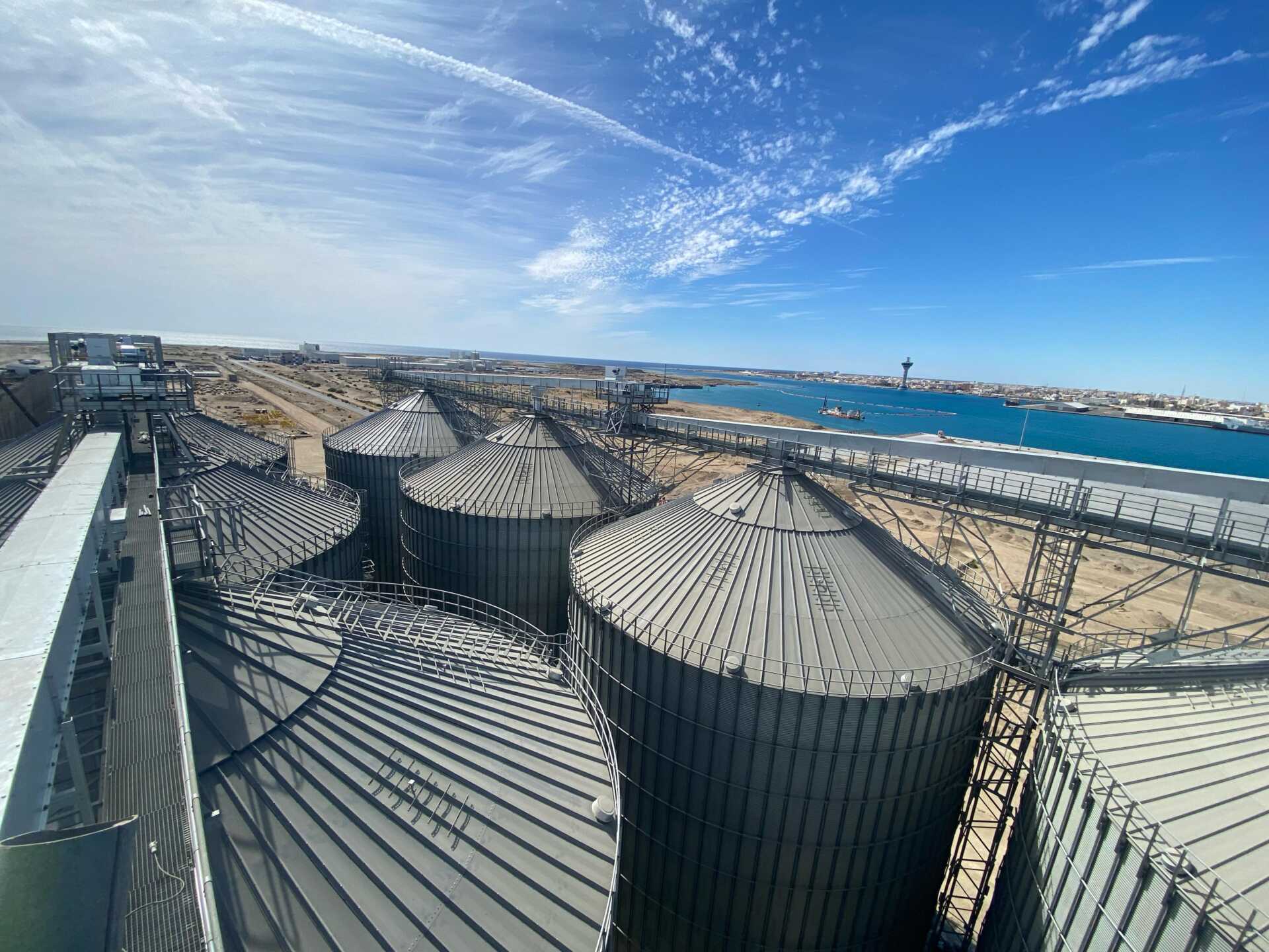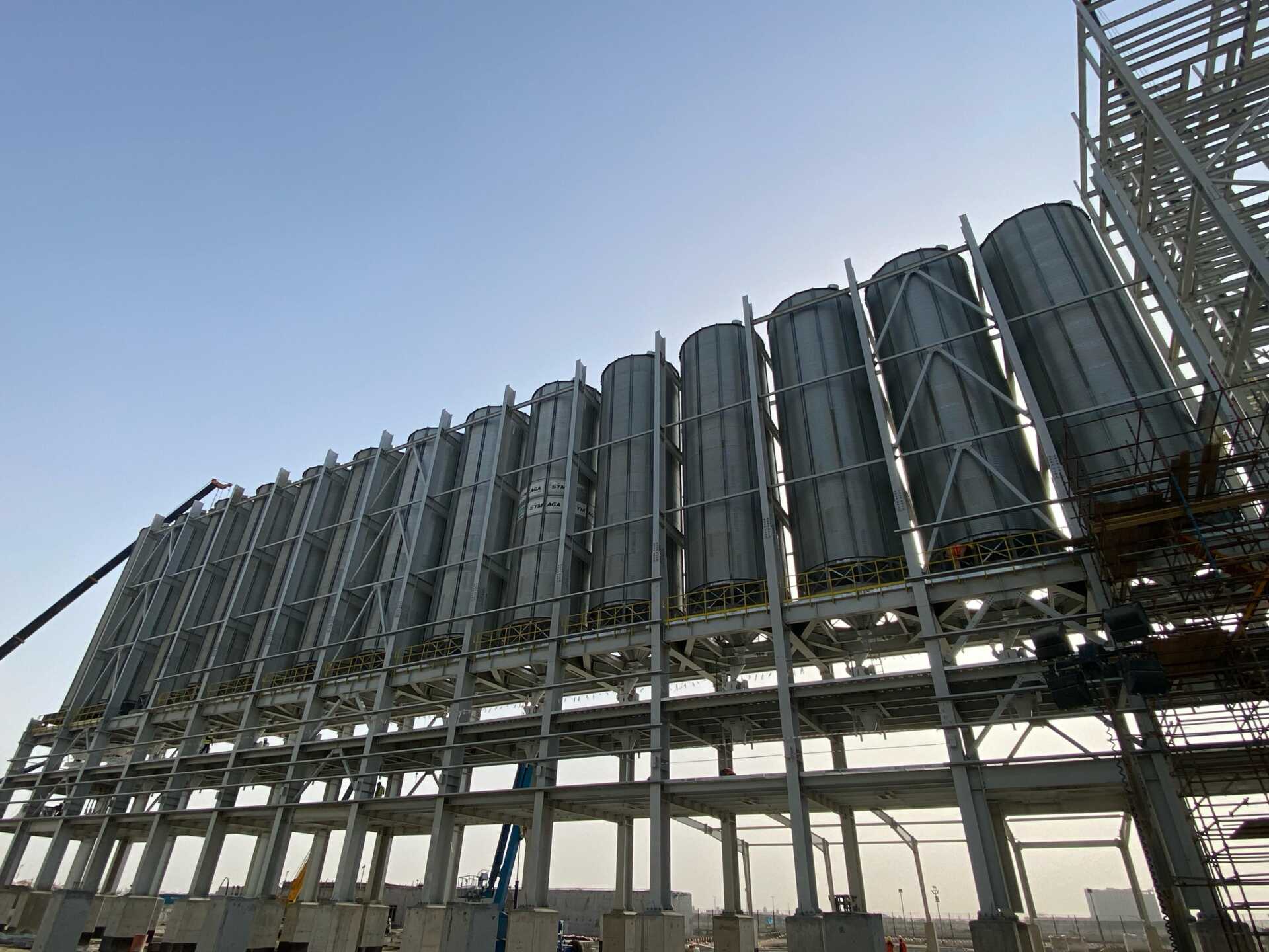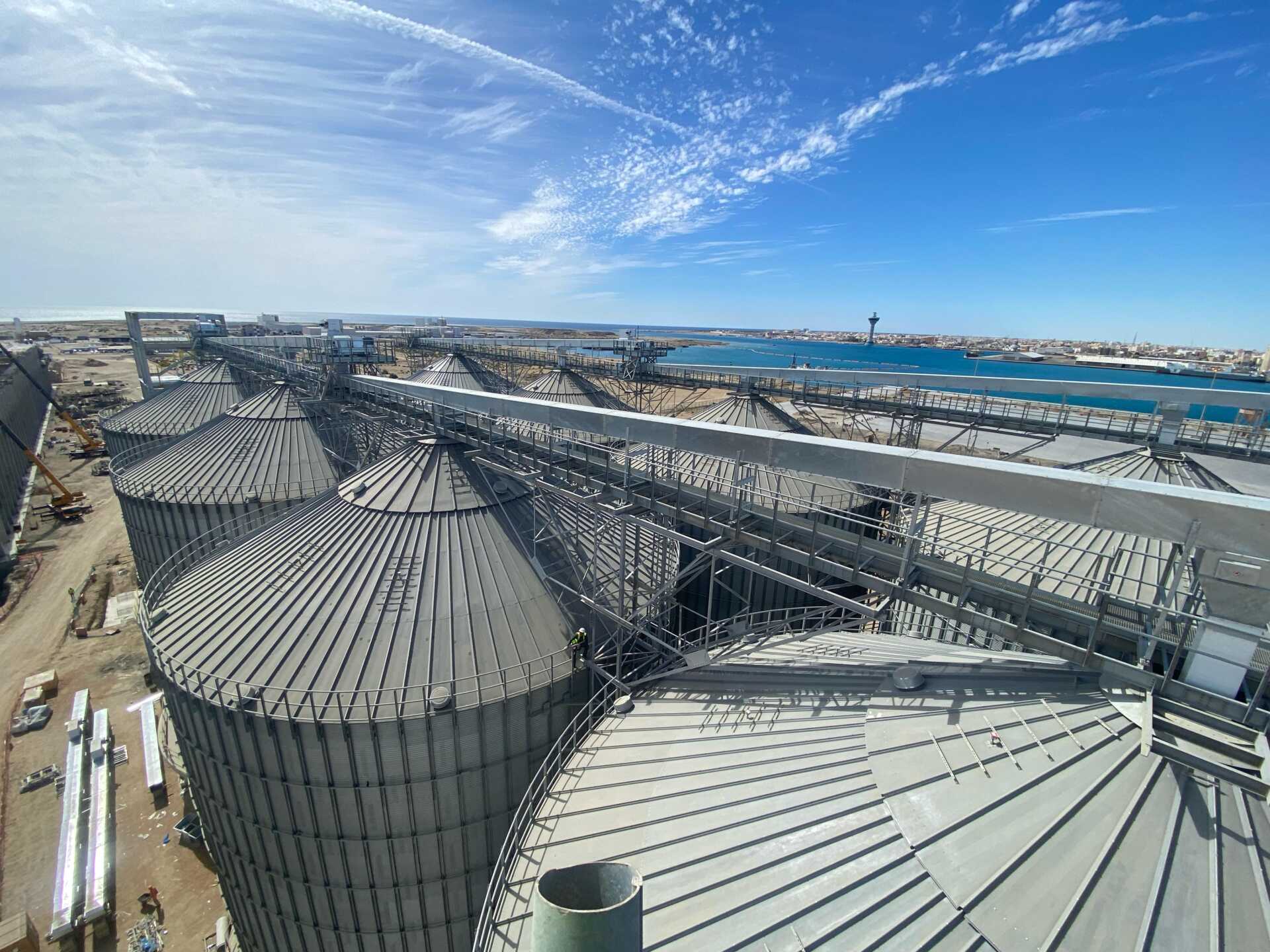 The grain terminal at Yanbu Port is being constructed by Haif Company on an area of 227,941 m². The project aims to enhance food security through steel silos and a warehouse with a total capacity exceeding 100,000 tons, in addition to a marine unloading crane and integrated infrastructure networks. Its value, after change orders, is estimated at around SAR 464 million.